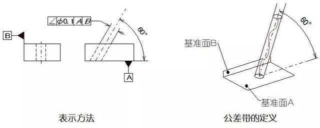 示例2:在公差值前加注記號(hào)Φ,則公差帶必須位于直徑為0.1mm的圓柱面內(nèi)。該公差帶應(yīng)平行于垂直于基準(zhǔn)A的平面B,并與基準(zhǔn)A呈理論正確角度60°。