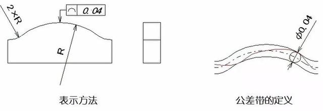示例:公差帶是由包絡(luò)一系列直徑為公差0.04mm的圓的兩包絡(luò)線(xiàn)之間的區(qū)域。諸圓的圓心位于具有理論正確幾何形狀的線(xiàn)上。