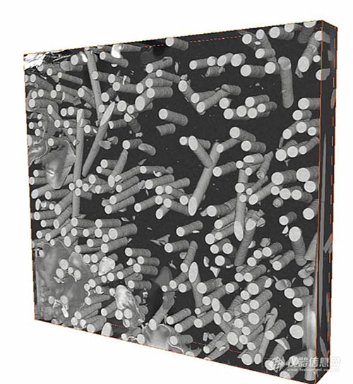 圖2.使用Helios Hydra CX DualBeam采用O+聚焦離子束和AS&V4軟件進行自動連續(xù)切片的汽車機油濾清器殼體(聚合物/玻璃纖維復合材料)的三維重構。HFW(水平寬度)為350μm。