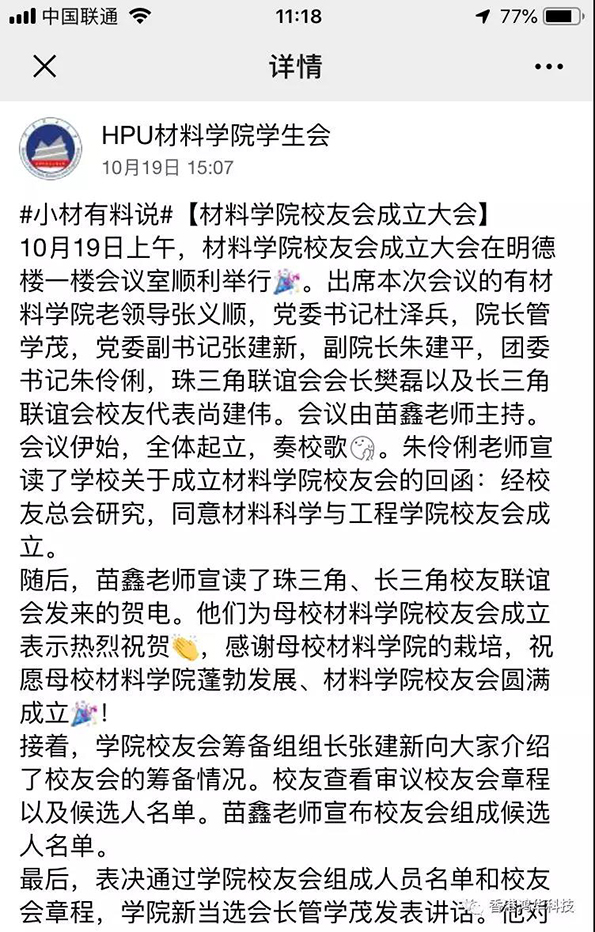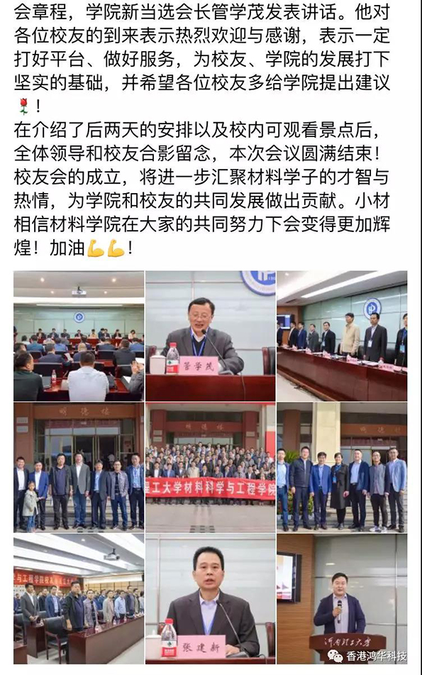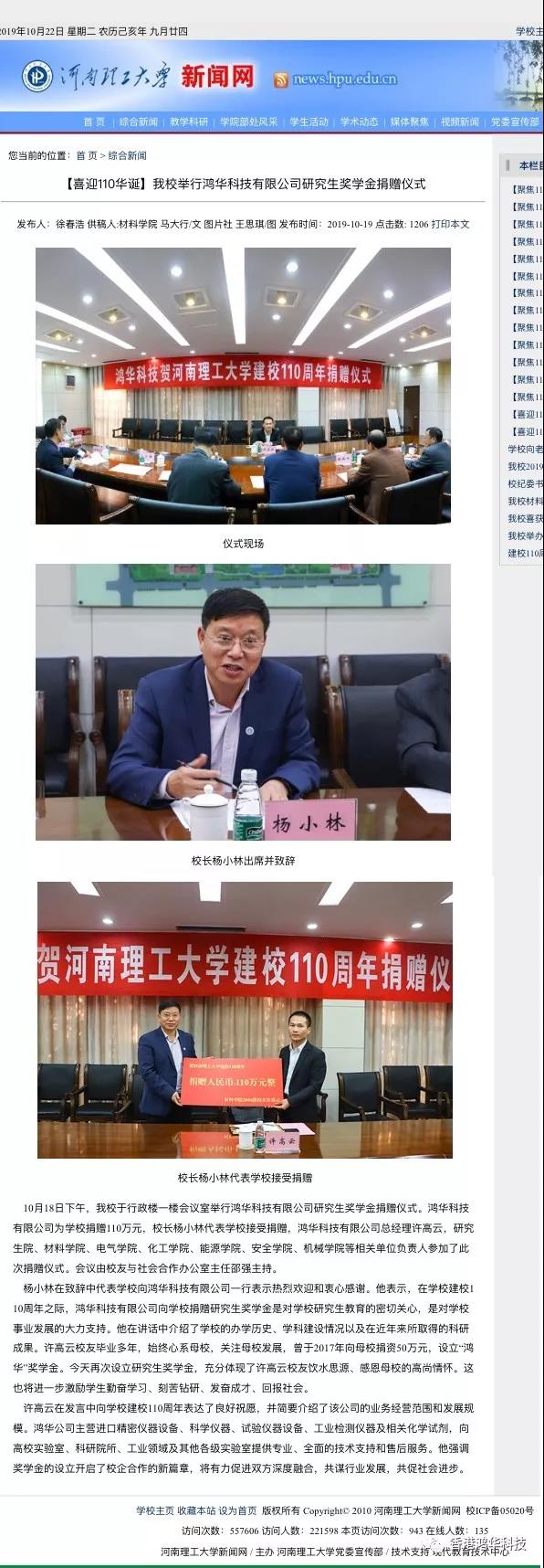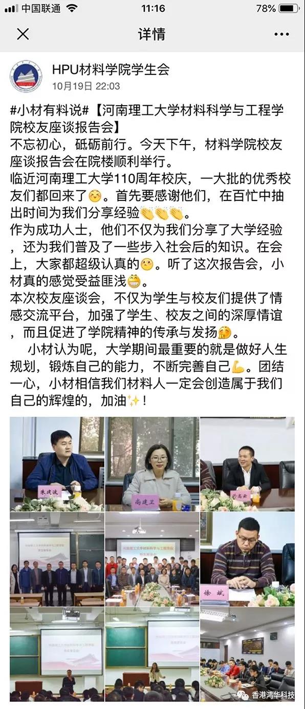 金秋十月,在偉大祖國慶祝建國70周年華誕之際,河南理工大學(xué)迎來了建校110周年慶典,一大批優(yōu)秀的校友們紛紛回校表示對母校的祝賀和感恩。鴻華科技有限公司總經(jīng)理許高云先生回到母校參加了一些列校慶活動,并向母校捐獻110萬元設(shè)立研究生獎學(xué)金;同時鴻華科技有限公司在河南理工大學(xué)材料科學(xué)與工程學(xué)院校友會成立大會上被推選為河南理工大學(xué)材料科學(xué)與工程學(xué)院校友會理事單位。